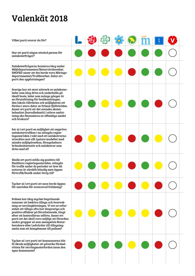 | Sverige har ett stort nätverk av snöskoterleder som idag drivs och underhålls på ideell basis, leder som många gånger är en förutsättning för besöksnäringen, den lokala tillväxten och möjligheten att färdas i stora delar av främst fjällvärlden. Anser ert parti att det svenska skoterledsnätet (huvudledsnät) i större omfattning ska finansieras av offentliga medel och brukare? | |